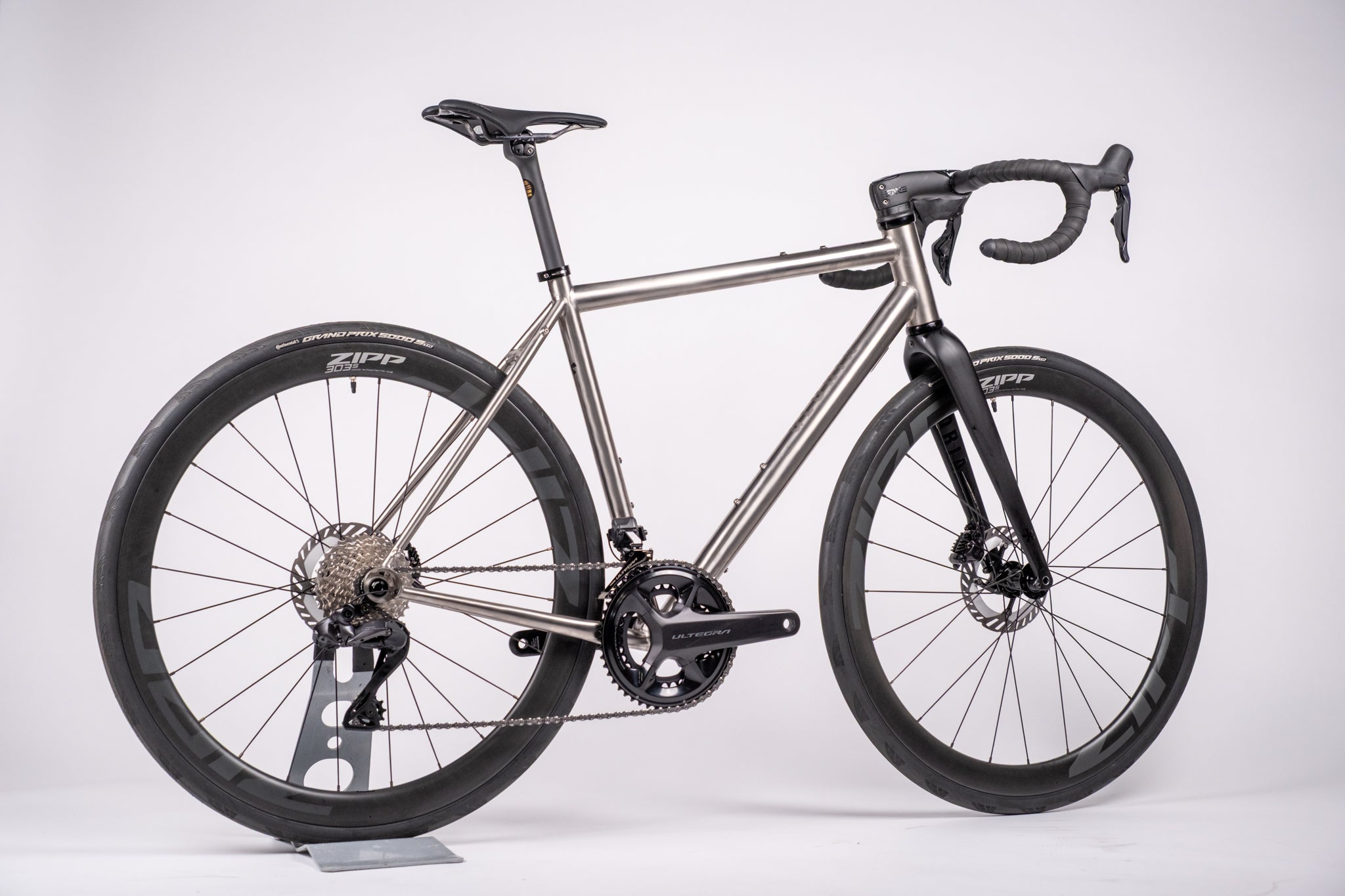The frame is constructed from 3AL-2.5V grade 9 titanium, with butted tubes.